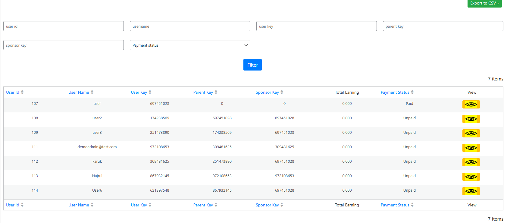 - Filter : You can filter user by date ,user id, username,userkey and position as well as with asseding and desending order.