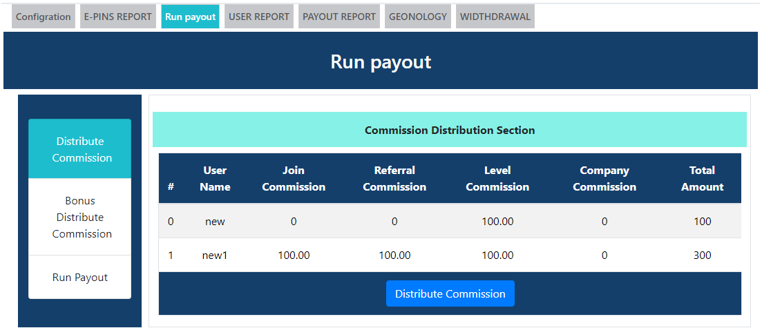 - Payout run : All commission,bonus and deduction is show here after distibution.