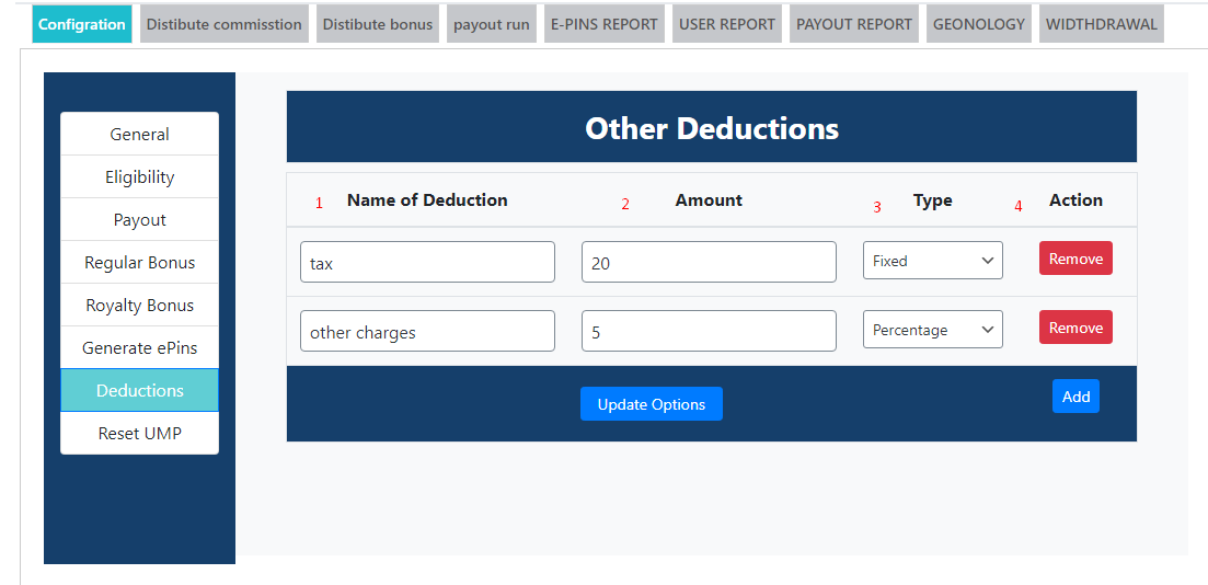 - Name of dudection --> Enter the name of deduction you want to charge on user income.
