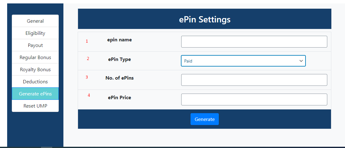 - E-pin type --> Select the e-pin type there are two type of e-pin free and paid, if you select paid then you will get another text box for e-pin price.