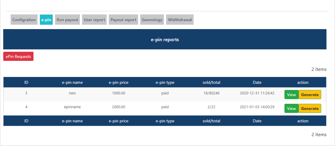 - Click on view to see the all epin report with this name epin.