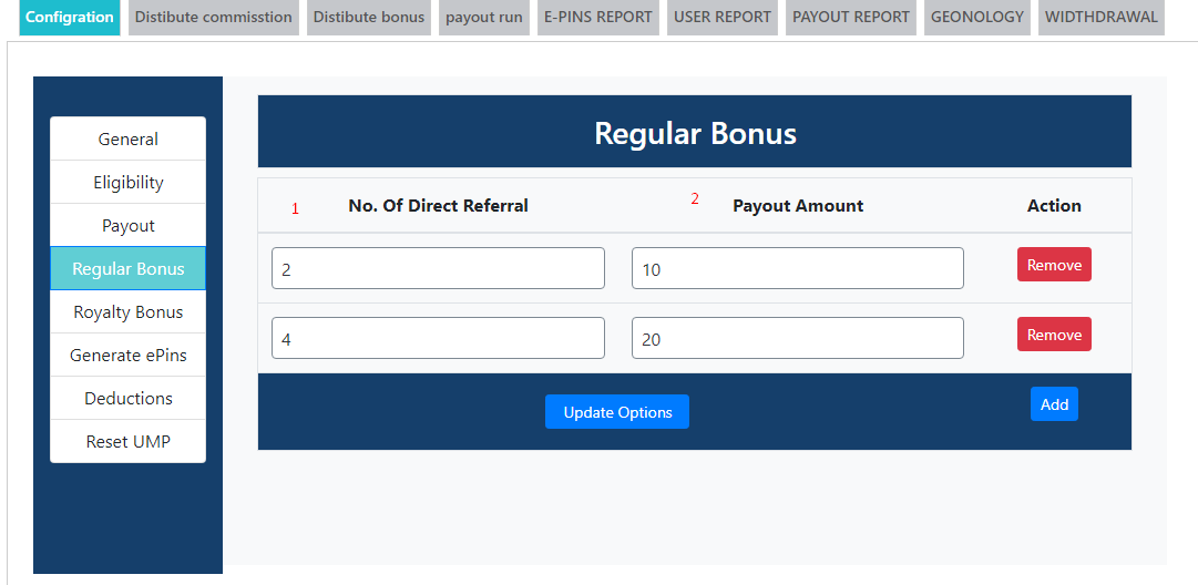 - Example --> Suppose you enter 2 direct referral if user add two dowenlines then he is eligibile for the amount, in the next textbox you give 4 direct referral if user add 4 dowenline then he is eligible for the amount, you can make condition how much do u want,you can add condition as well as you can delete it .