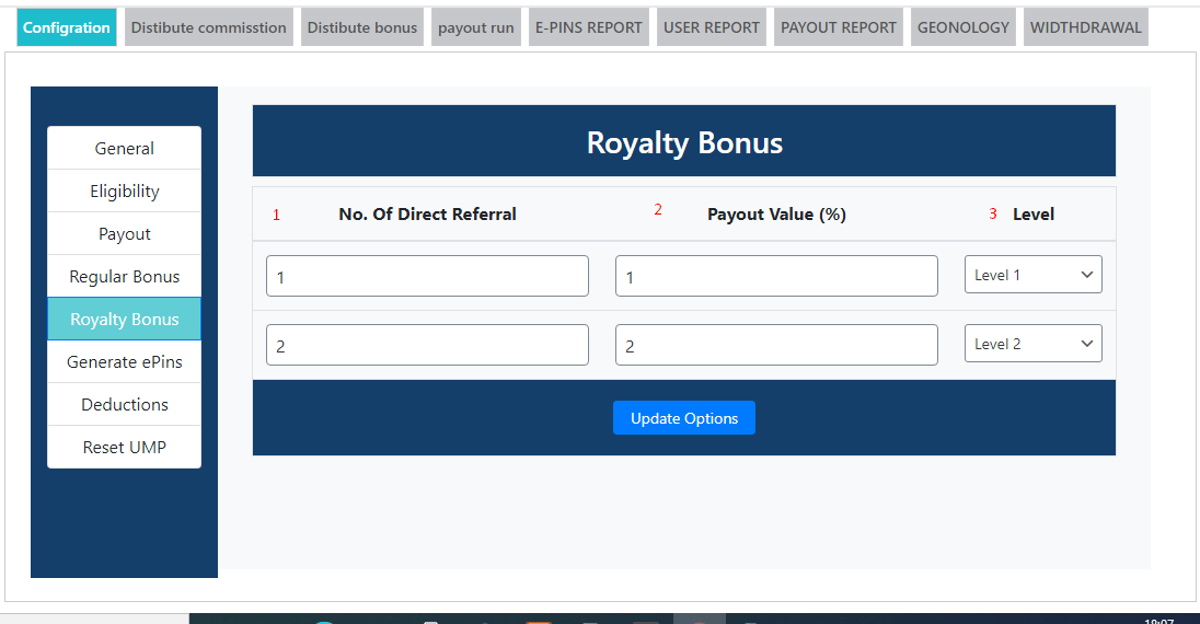 - Example --> Suppose you enter 2 direct referral if you add two dowenlines and you are at the level that is given in level box then you are eligibile for the amount that is given you will get this amount, in the next textbox you give 4 direct referral if you add 4 dowenline and you are at the level that is given then you are eligible for the amount that is given, these condition are less or more according to no. of level that is given in genreal settings .